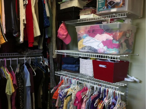 If the top of my closet looks less organized, that is because instead of packing away bulky winter coats in totes, I decided to use the extra space in my closet to hang them for the summer.