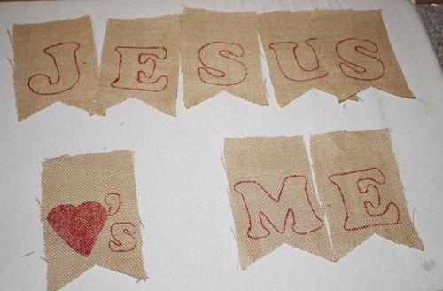 1. Cut out the template pieces and then trace the bunting pattern onto the burlap eight times.