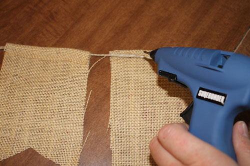 4. Hot glue the burlap pieces to the twine. Fold the top of each burlap piece, towards the back, and hot glue in place.