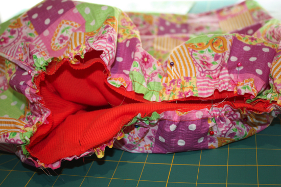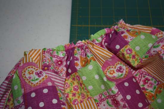 Sew a gathering stitch around the top of your skirt piece, 1/4 of an inch from the top. Don’t tie off either end.